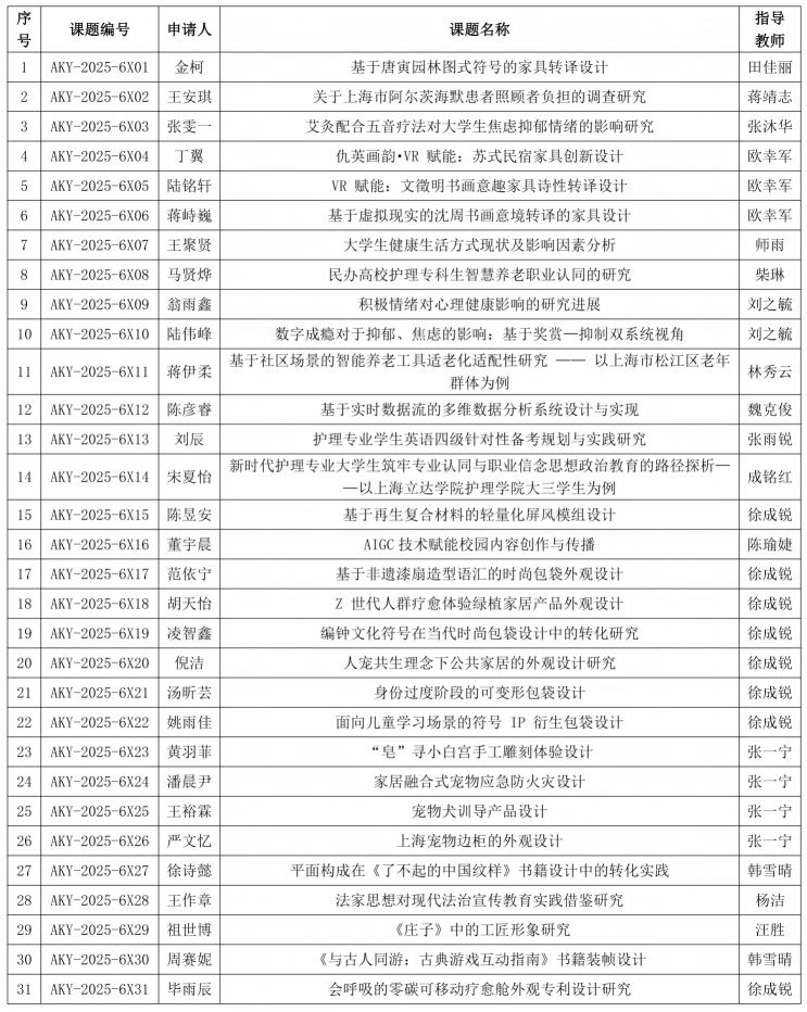 2025年度校级科研学生专项经个人申报、专家评审和公示,共立项31项,现将立项结果公布如下。